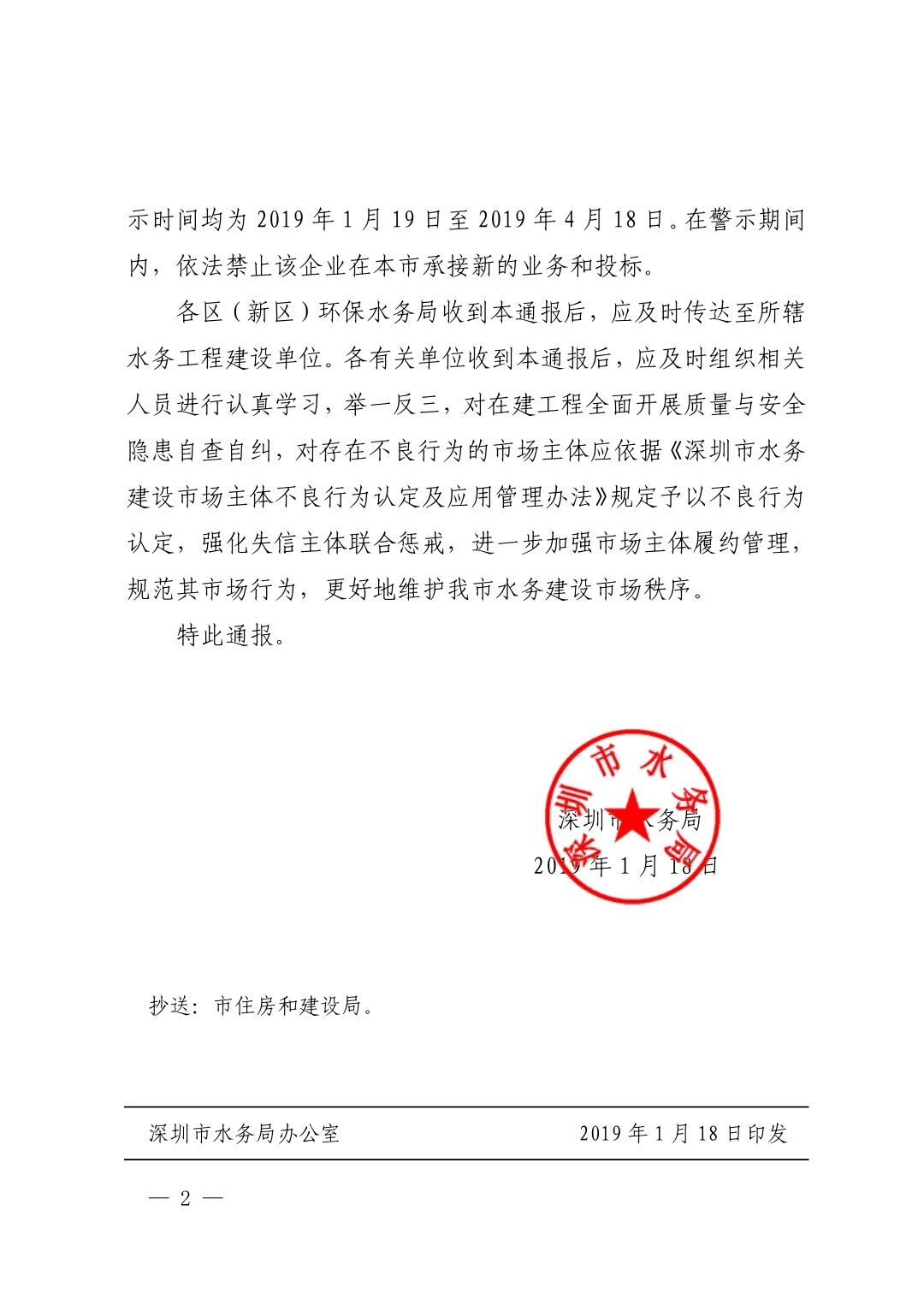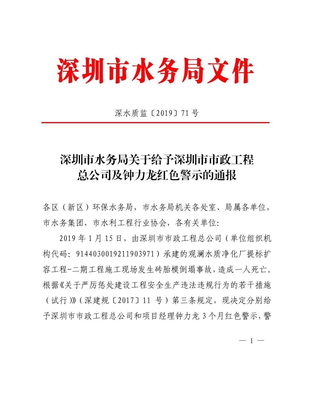 深圳市水务局关于给予深圳市市政工程总公司及钟力龙红色警示的通报