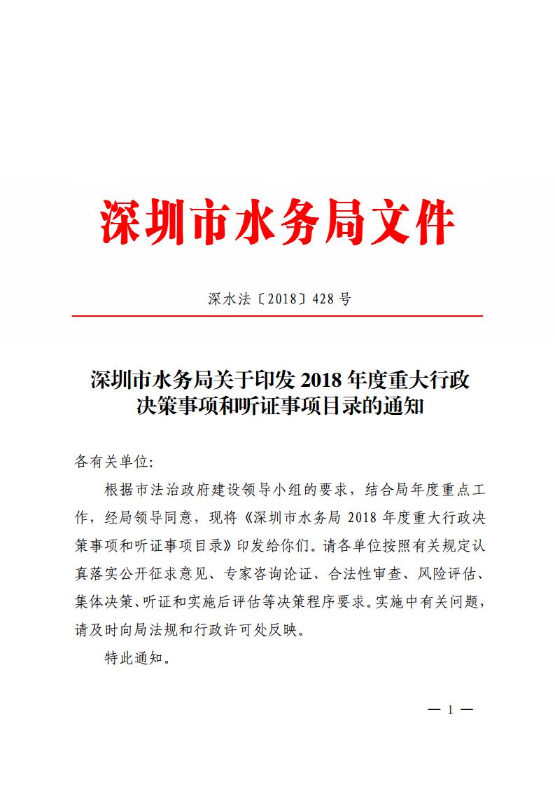 深圳市水务局关于印发2018年度重大行政决策事项和听证事项目录的通知