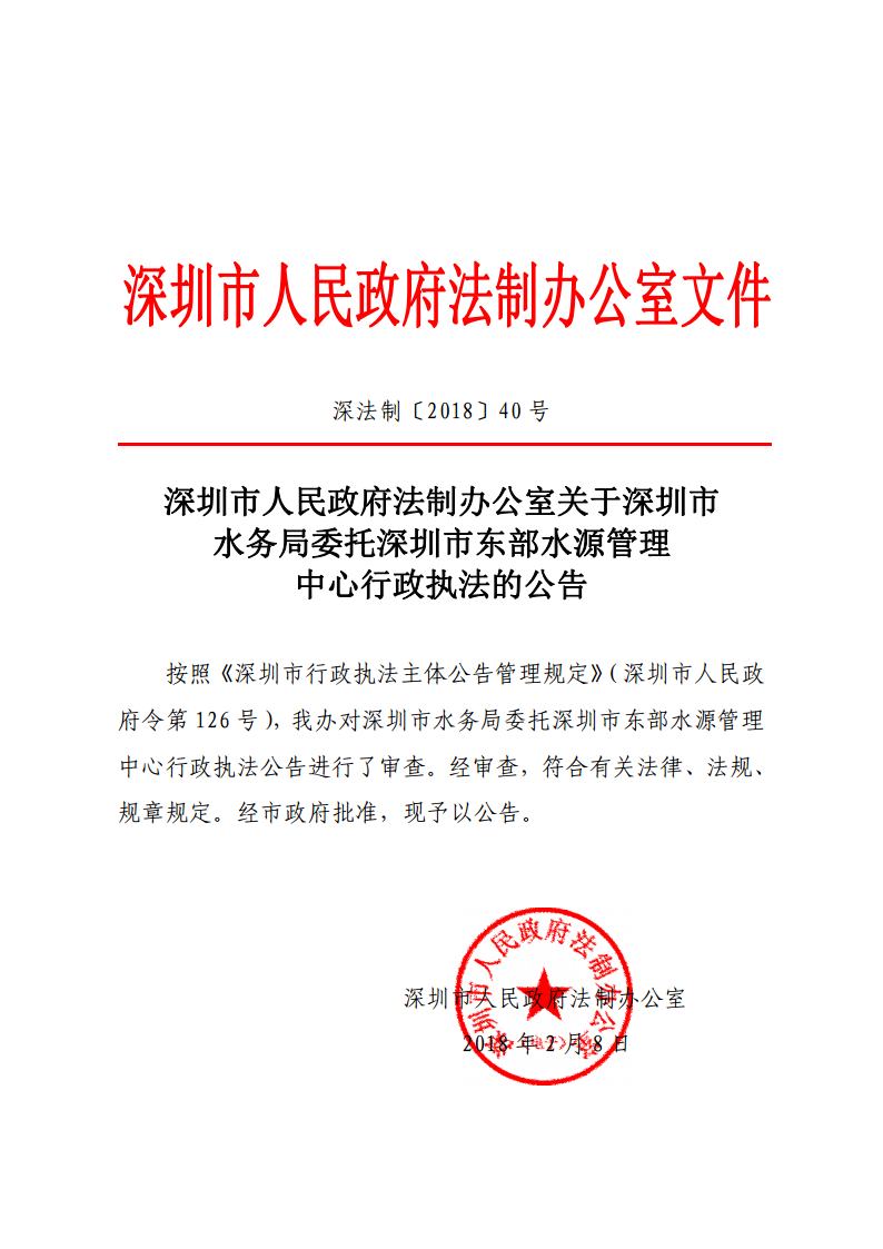 深圳市人民政府法制办公室关于深圳市水务局委托深圳市东部水源管理中心行政执法的公告