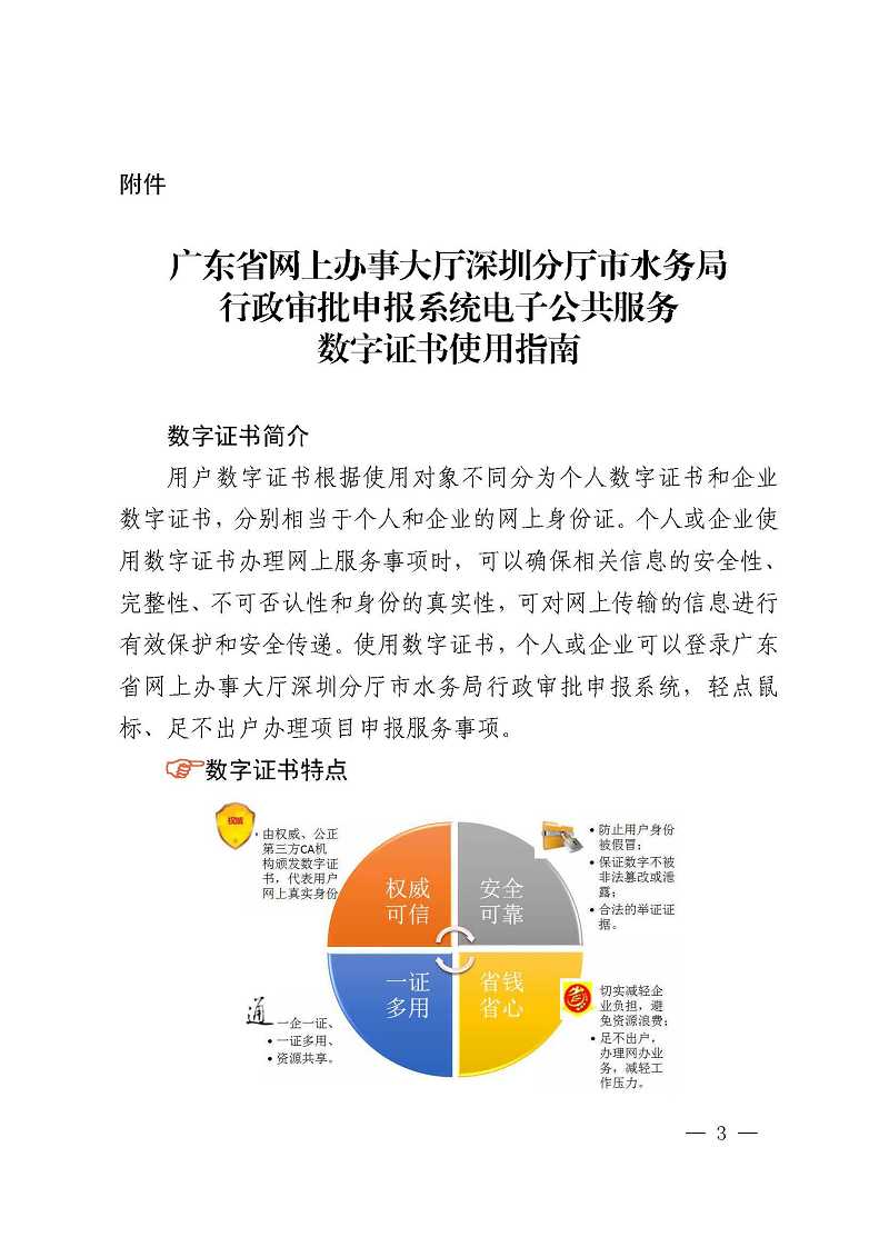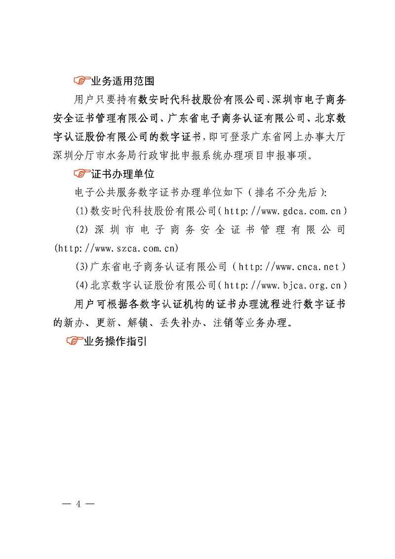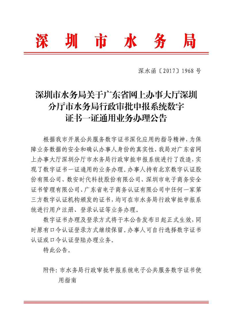 深圳市水务局关于广东省网上办事大厅深圳分厅市水务局行政审批申报系统数字证书一证通用业务办理公告