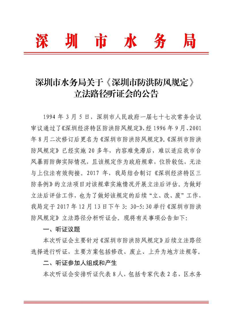 深圳市水务局关于《深圳市防洪防风规定》立法路径听证会的公告