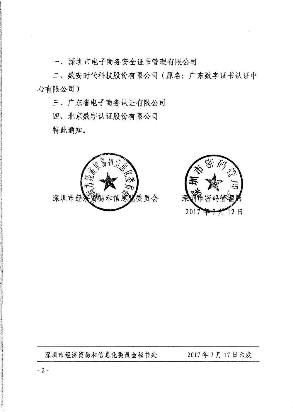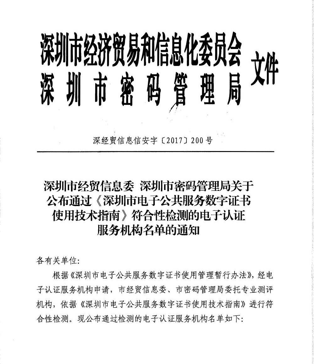深圳市经贸信息委 深圳市密码管理局关于公布通过《深圳市电子公共服务数字证书使用技术指南》符合性检测的电子认证服务机构名单的通知