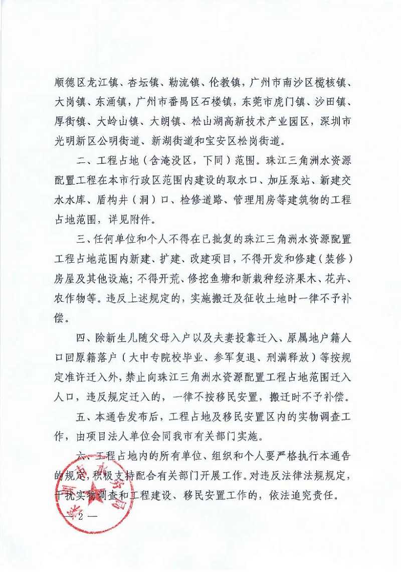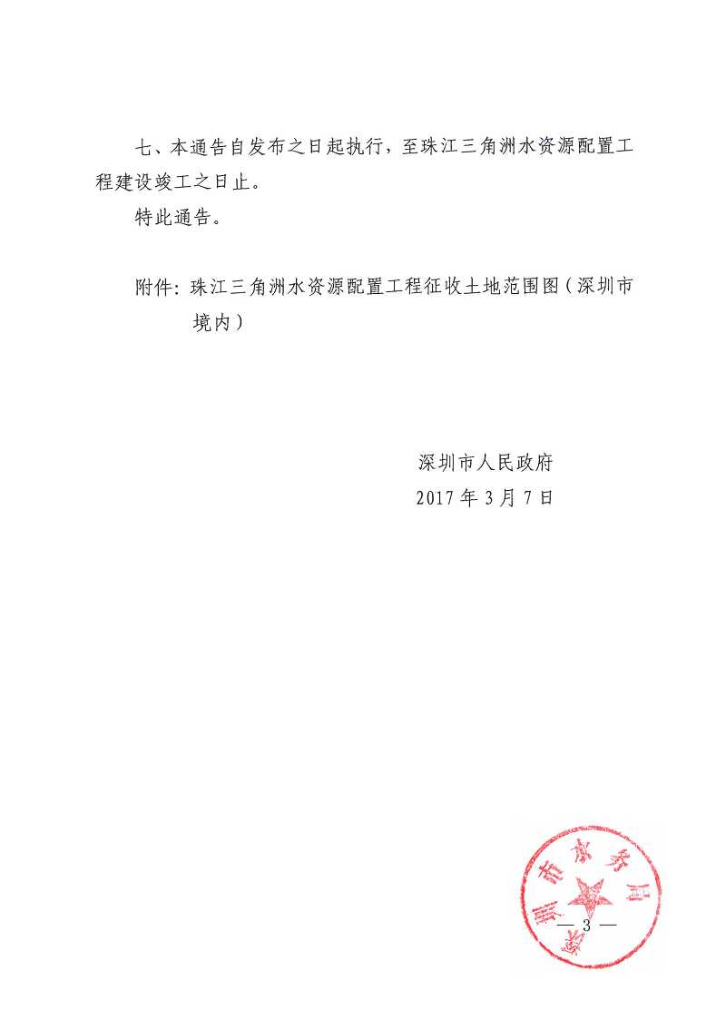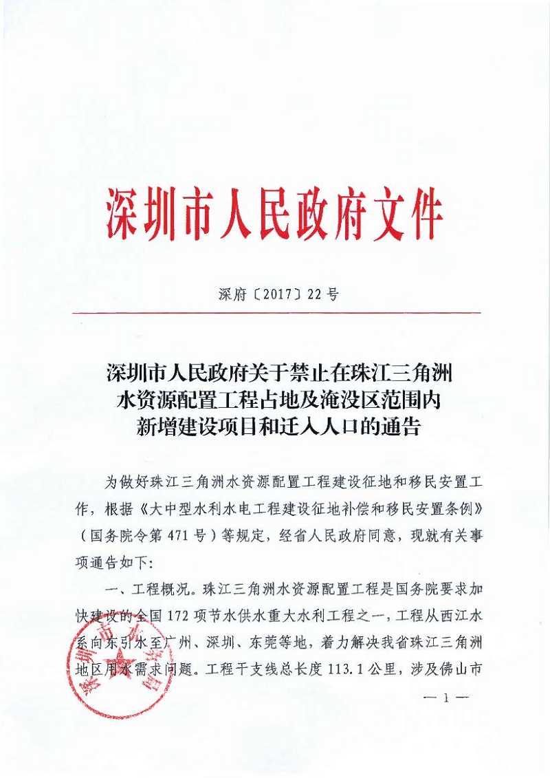 深圳市人民政府关于禁止在珠江三角洲水资源配置工程占地及淹没区范围内新增建设项目和迁入人口的通告