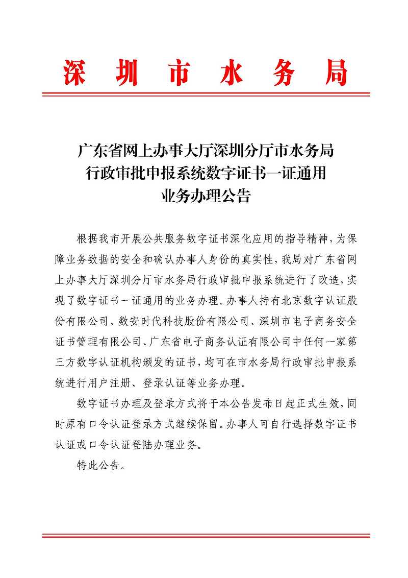 市水务局行政审批申报系统数字证书一证通用业务办理公告