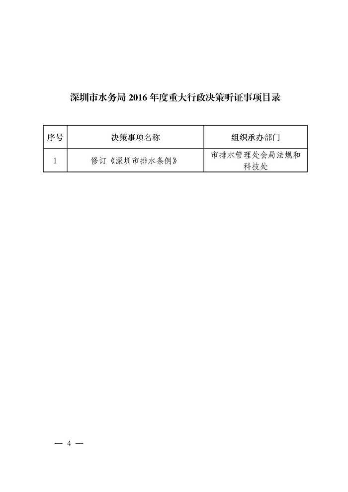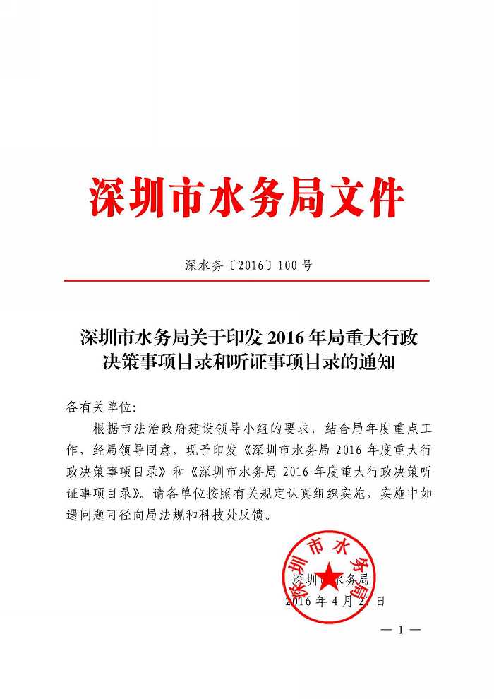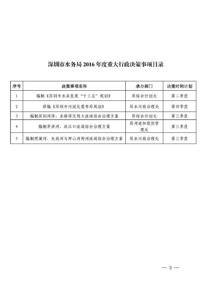 深圳市水务局关于印发2016年局重大行政决策事项目录和听证事项目录的通知