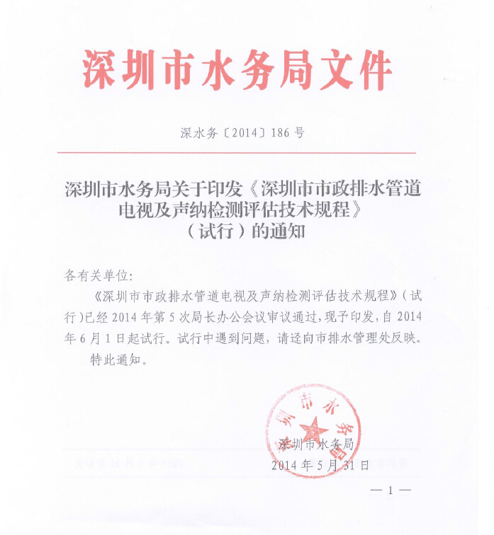 深圳市水务局关于印发《深圳市市政排水管道电视及声纳检测评估技术规程》(试行)的通知