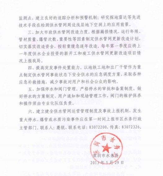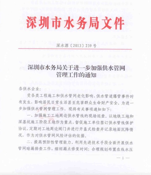 深圳市水务局关于进一步加强供水管网管理工作的通知