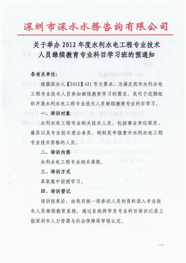 关于举办2012年度水利水电工程专业技术人员继续教育学习班的预通知