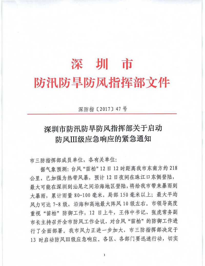 深防指【47号】关于启动防风III级应急响应的紧急通知