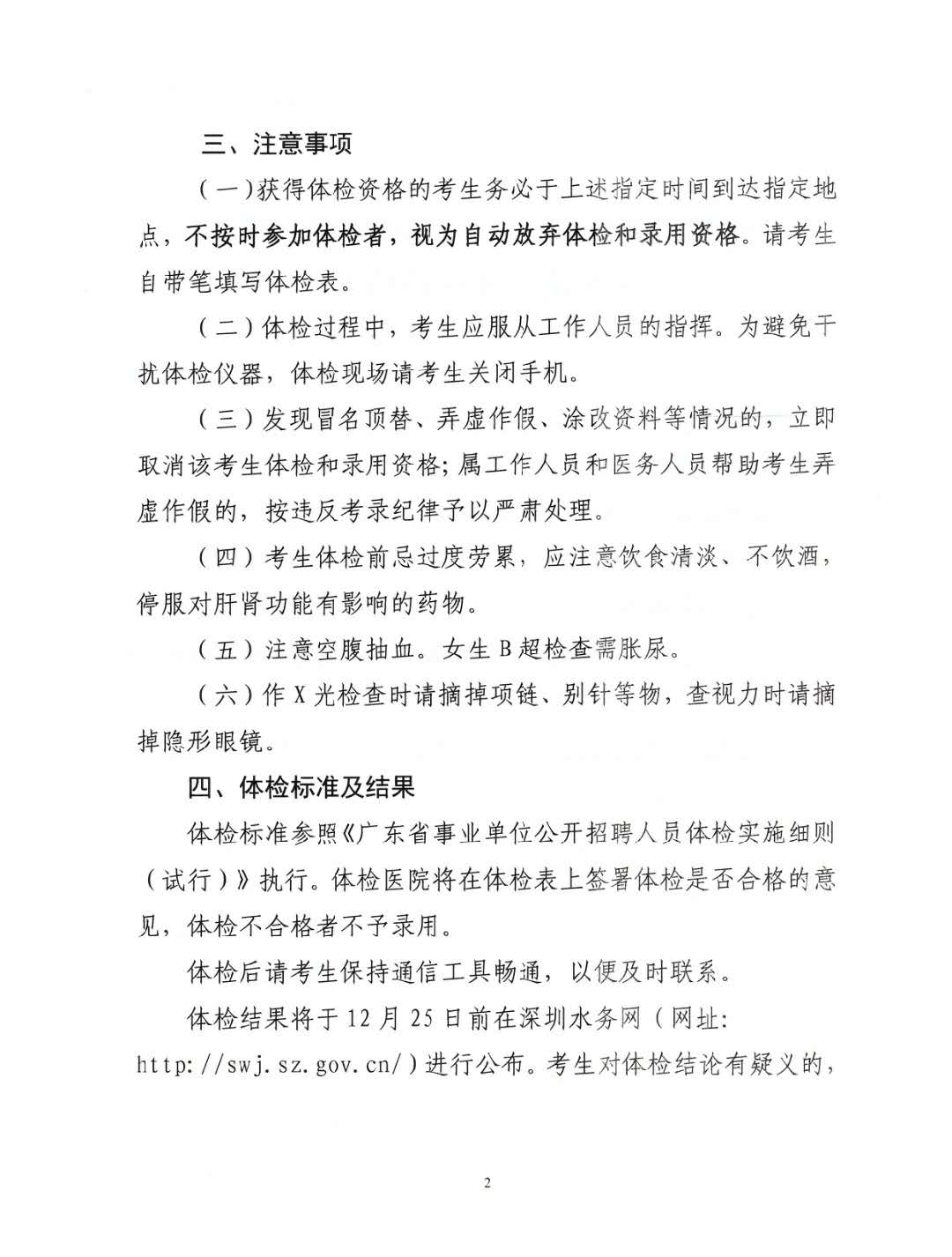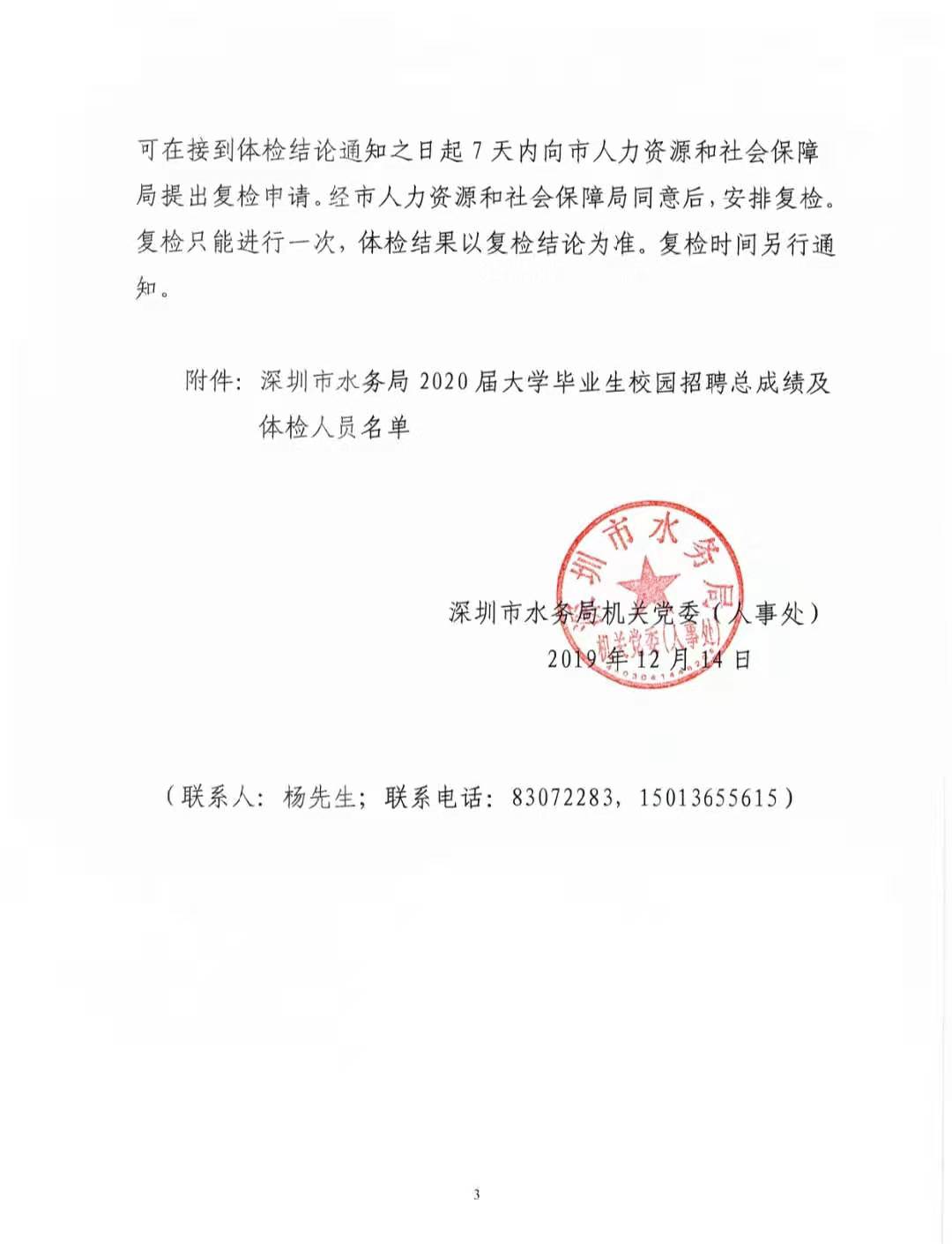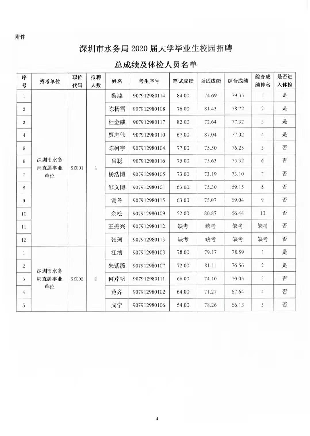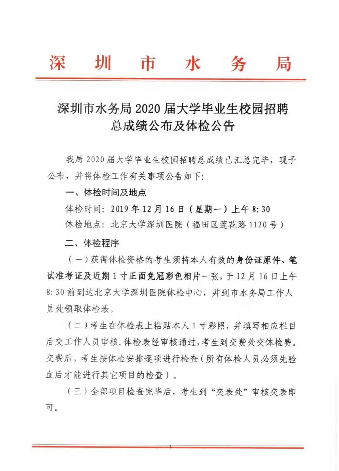 深圳市水务局2020届大学毕业生校园招聘总成绩公布及体检公告