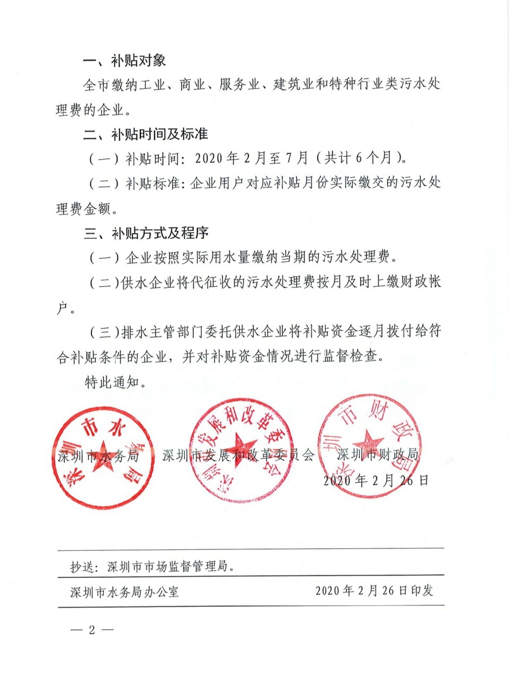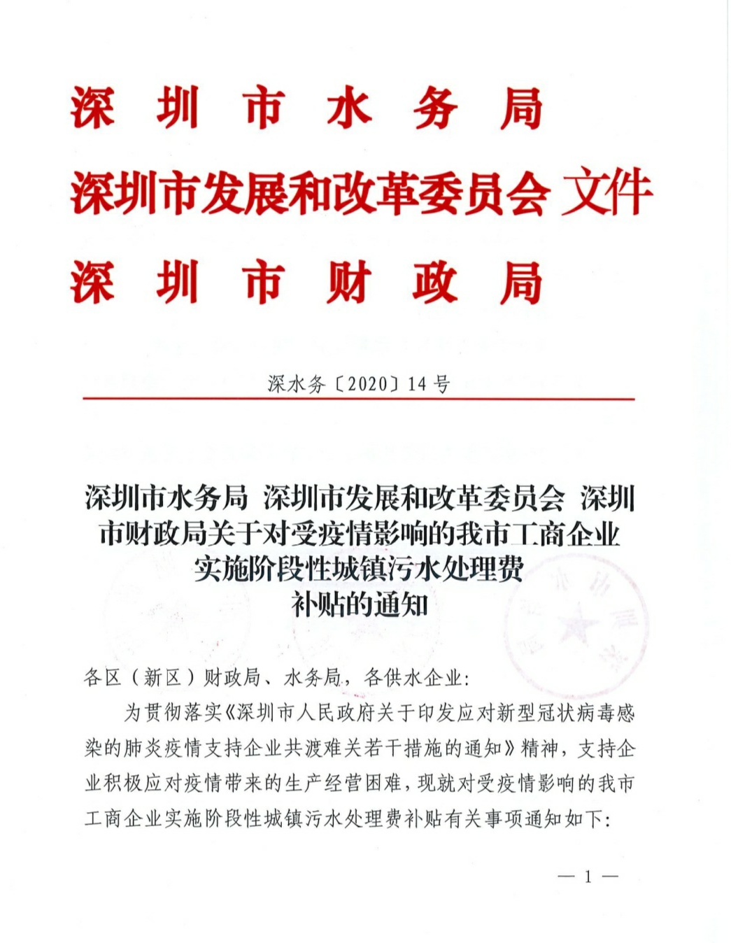 深圳市水务局 深圳市发展和改革委员会 深圳市财政局关于对受疫情影响的我市工商企业实施阶段性城镇污水处理费补贴的通知