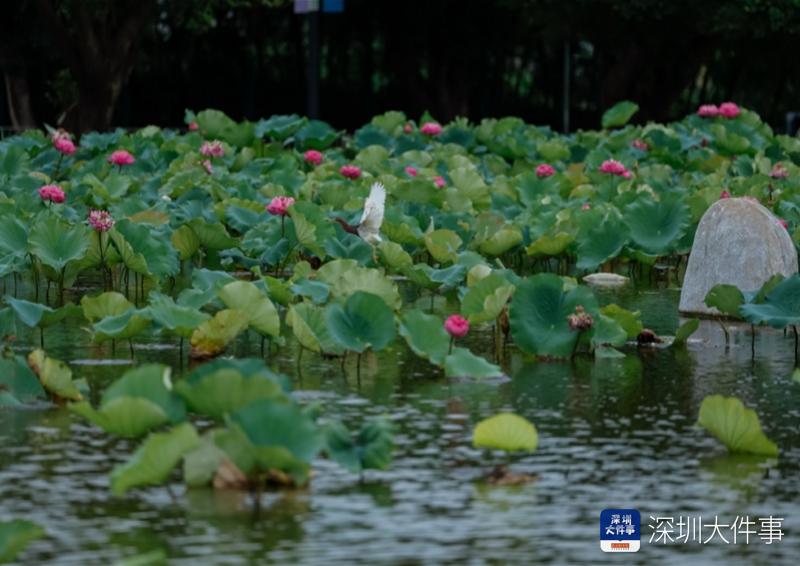 坐落于坪山河畔汤坑路以东,占地面积约7000平方米的碧岭水质净化站,采用半地下式一体结构,深埋地下约20米,不仅极大节省了土地资源,更以隐形守护者的姿态,默默守护着城市的碧水蓝天。地上主要部分,是精心打造的水景观公园,荷花池中,一只鸟儿振翅高飞,红白相间的羽毛在阳光下熠熠生辉,它似乎在诉说着这里水质净化后的清澈与生机。周围荷叶田田,荷花亭亭,与远处的树木和草地共同编织成一幅宁静自然的生态画卷,成为市民休闲散步、亲近自然的好去处。